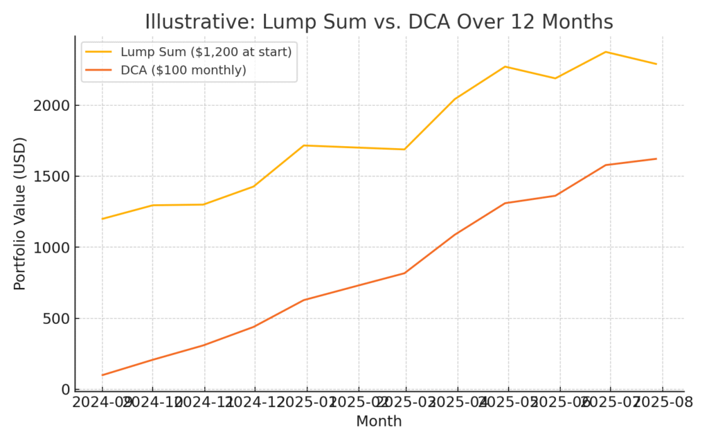 - Dollar-Cost Averaging (DCA): Invest smaller amounts regularly, such as weekly or monthly. This strategy smooths out volatility and reduces the pressure of trying to “time the market.”